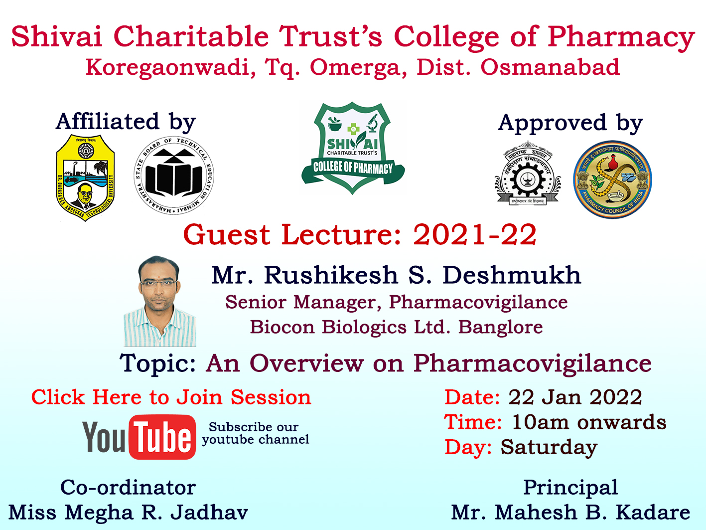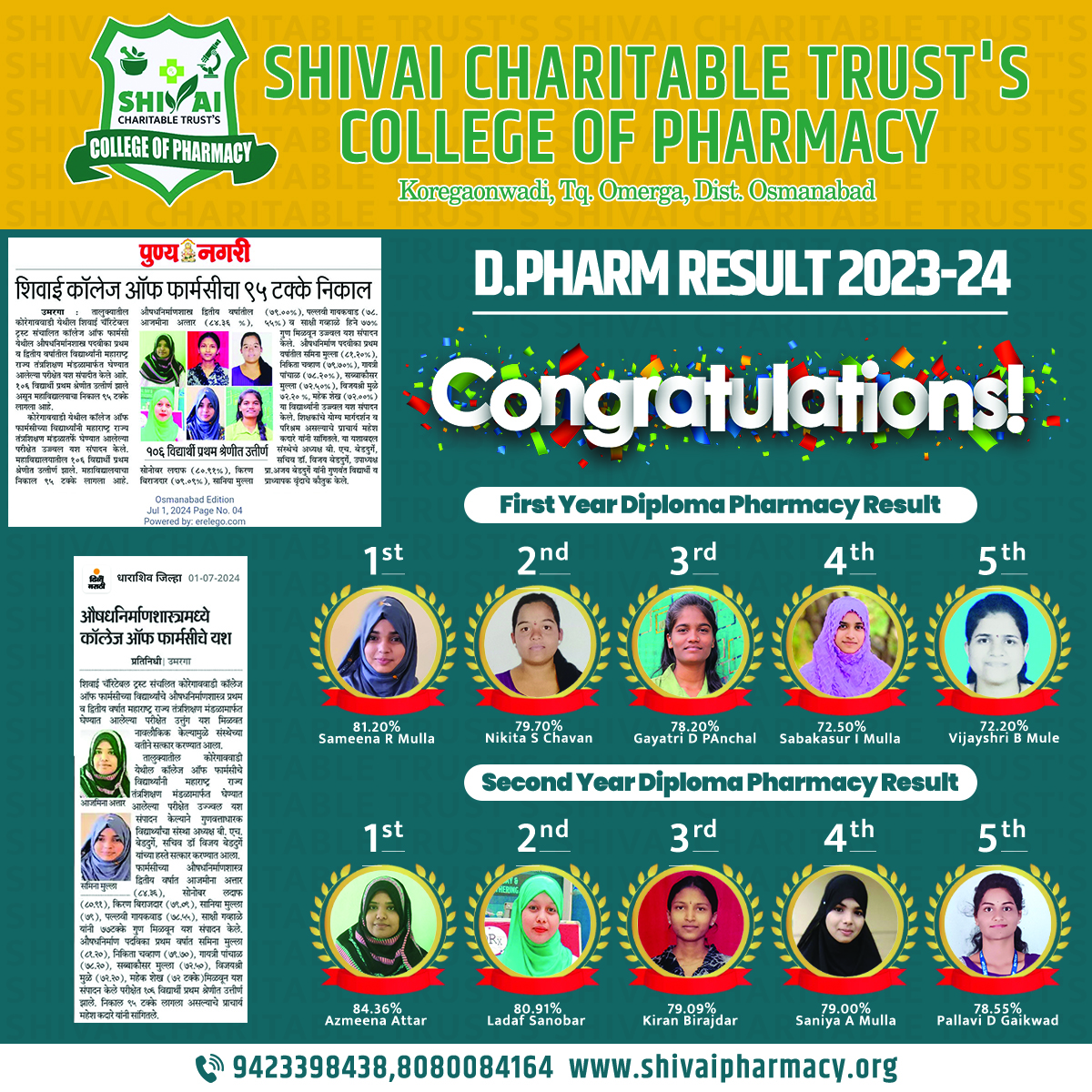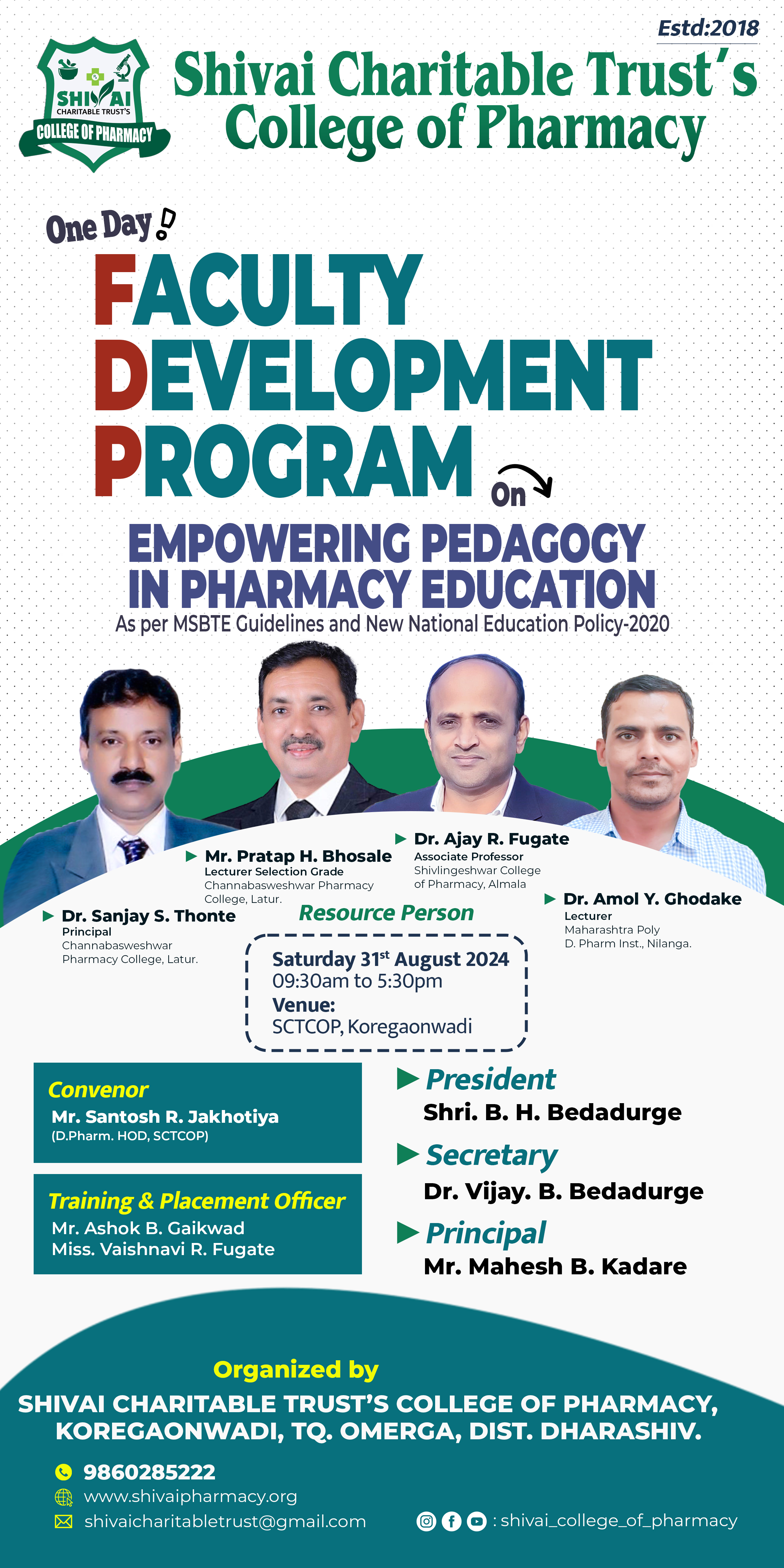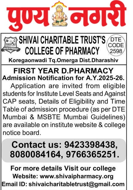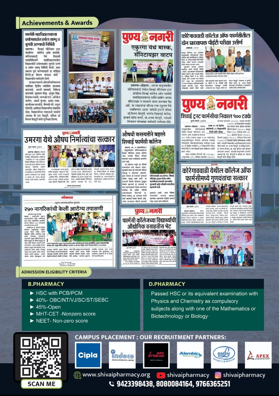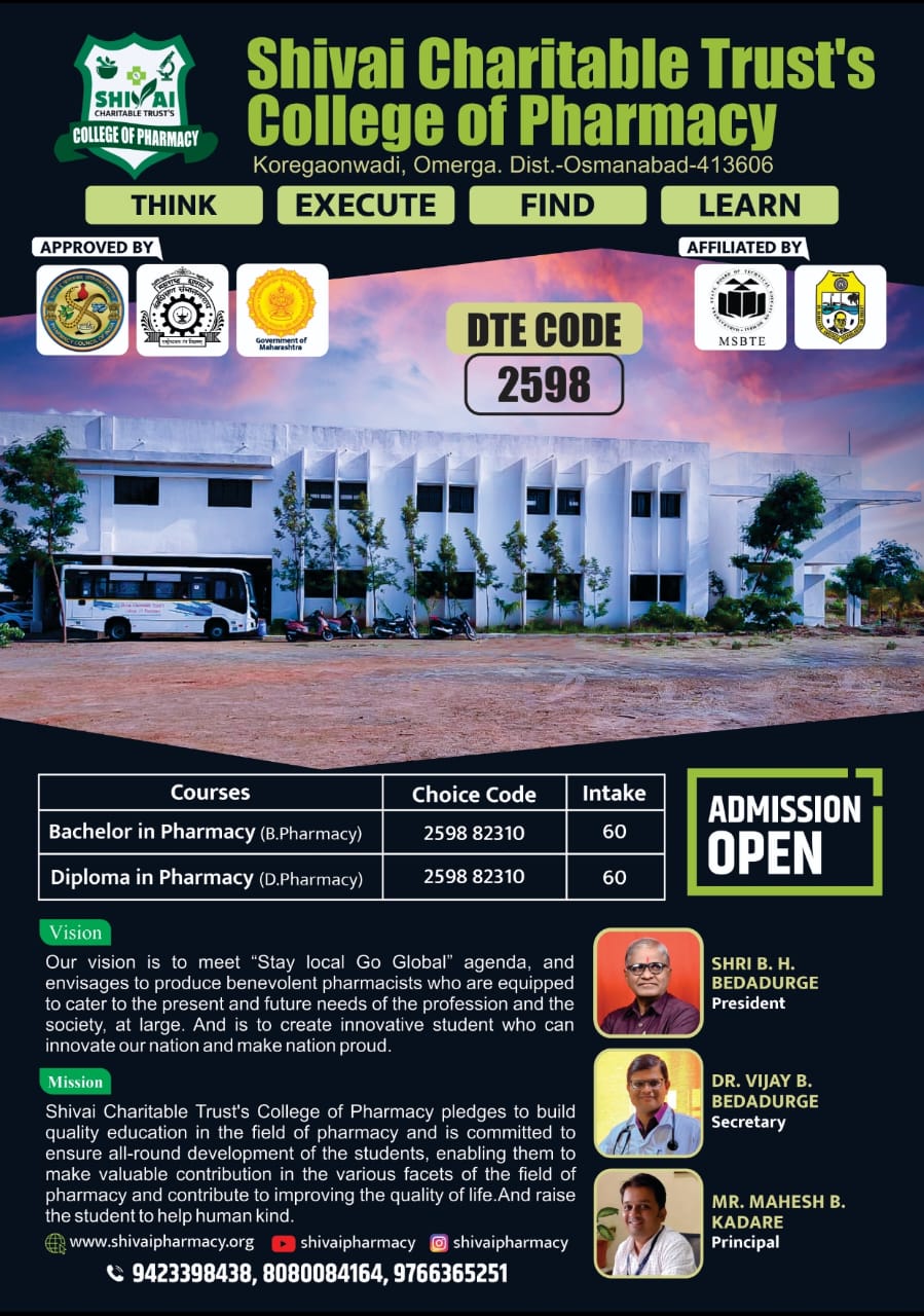 Shivai Charitable Trust has been established by Hon. Bargali H. Bedadurge in 2017, Shivai Charitable Trusts College of Pharmacy established in rural area at good environment with single minded goal to impart value-based student-centric education, with excellent lab facilities, good teaching and learning practices majorly based on student feedback systems, is a model pharmacy school conducting D. Pharmacy & B. Pharmacy programmes.